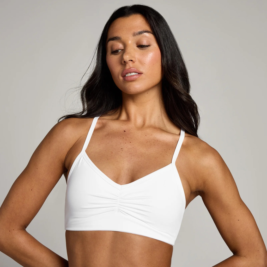 Az MP Női Tempo Ruched Front sportmelltartó fehér színben a teljesítmény és a stílus ötvözete, aktív nők számára.