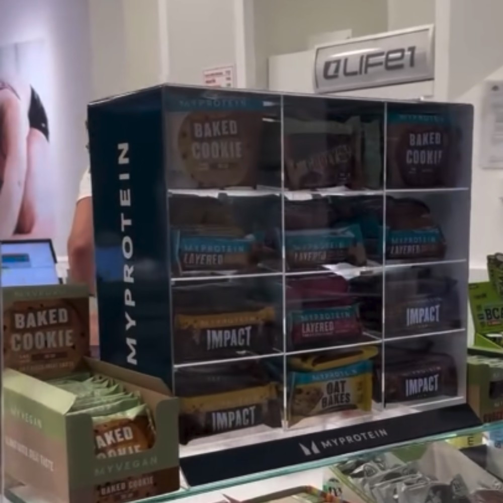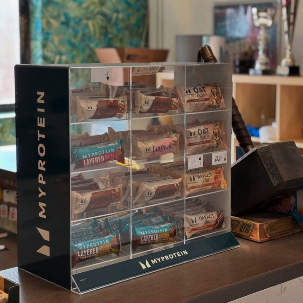 Myprotein márkajelzett, 12 rekeszes kináló pult. Elől zárt kivitel, hátulról tölthető
